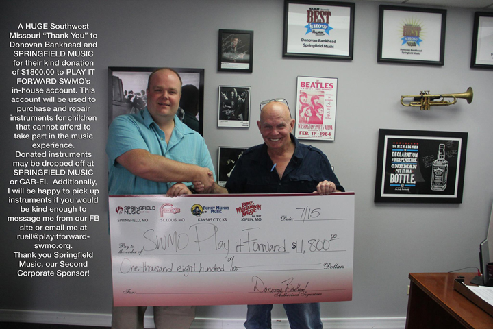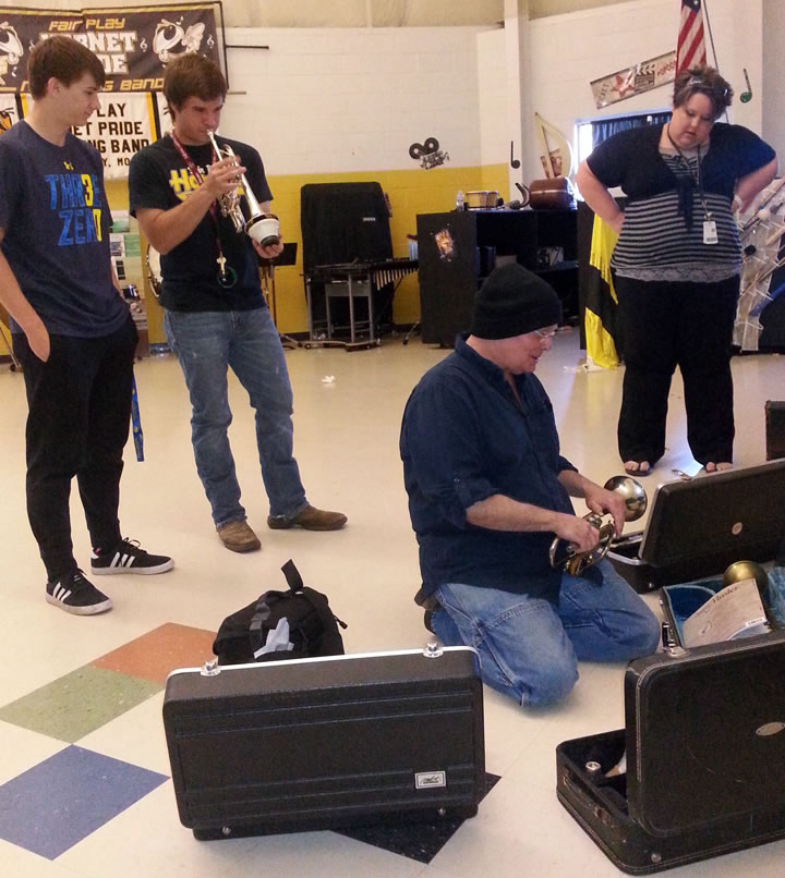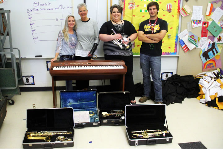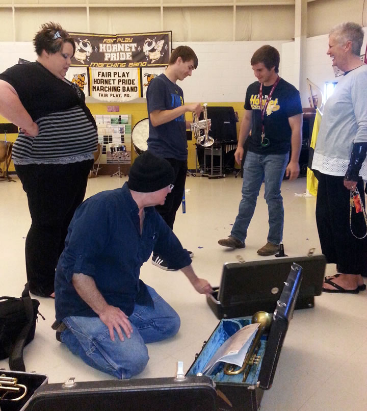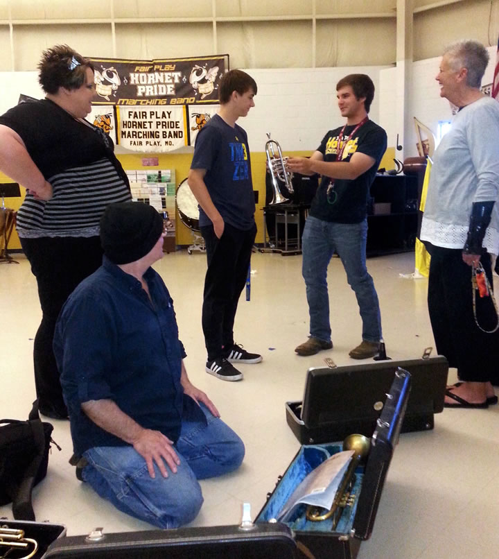 Play It Forward SWMO is proud to announce our first donation to a local school partner. The Fair Play Music Department was the recipient of two saxes, two trumpets, a coronet, and a keyboard. Notable is the fact that Fair Play is one of the only remaining 1A schools with a music program due to budget cuts.